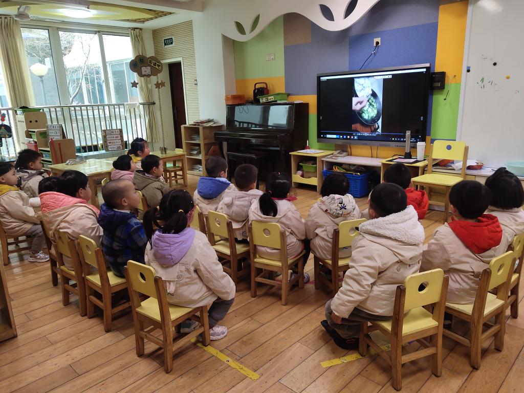 疫情关系,家长不能入园,所以陈奶奶拍摄了一个视频,指导孩子们制作青菜瘪子团。通过观看视频,幼儿了解到制作青菜瘪子团所需要的材料及制作过程,在之后的百味室场的活动中能够自己尝试制作青菜瘪子团。