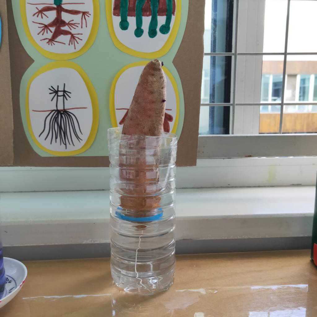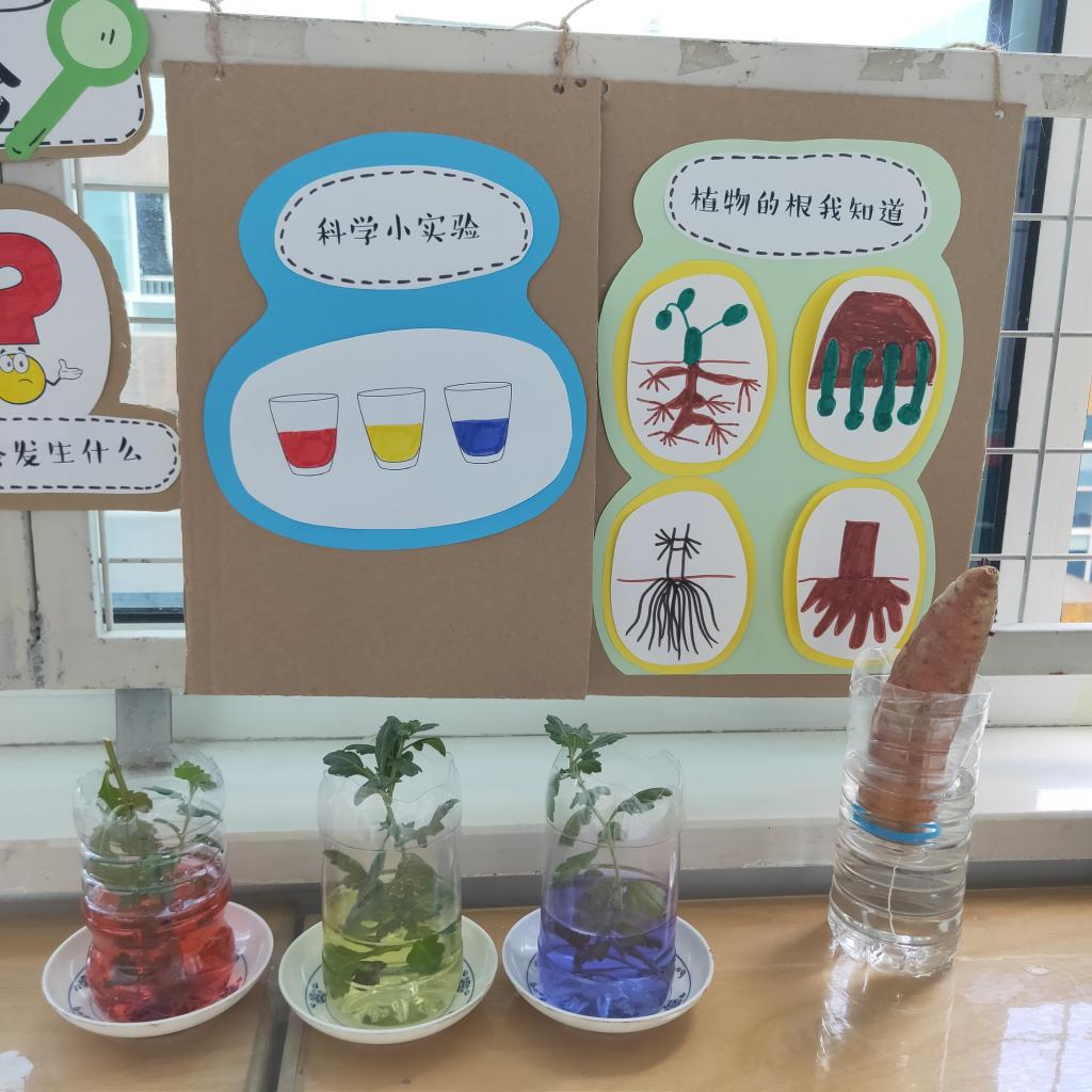 我们的自然角又加入了新的植物。第一处是奇妙三色花,这是一个神奇的科学小实验,幼儿将会观赏到泡在三种颜色的水中的同种植物,猜一猜、看一看这三株植物究竟会发生怎样的变化。第二处观察点叫做有趣的树根,这个区域的主角是一颗红薯,红薯的根部在水中已经有了明显的变化,小朋友们都很期待看到根部的进一步变化呢!第三处新区域里有一个大箱子,通过一个大黑洞小朋友可以看到一个全新的世界,原来植物在小黑屋里也能茁壮成长呢!