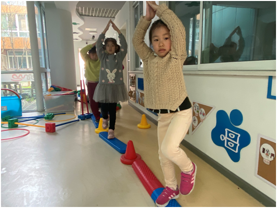 我们练习单脚站立,看看我们一个个神气的样子,我们在平衡木上坚持了很久呢!以后要多多练习。