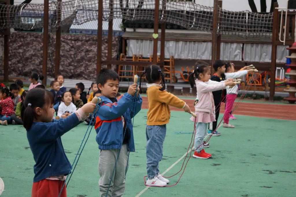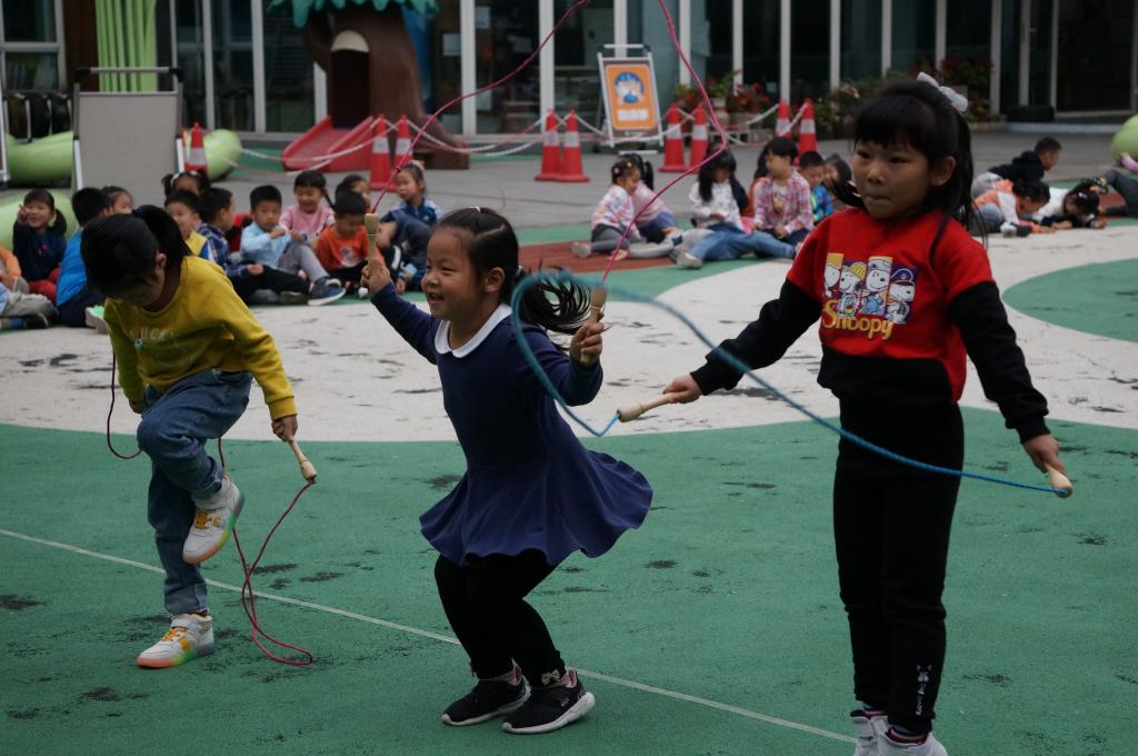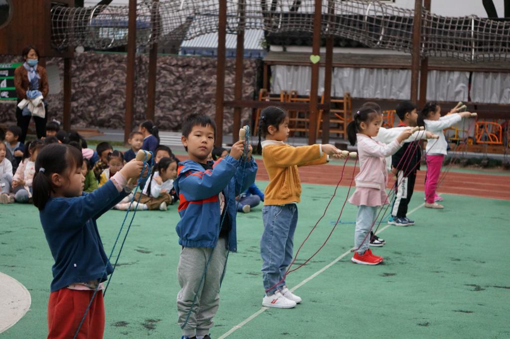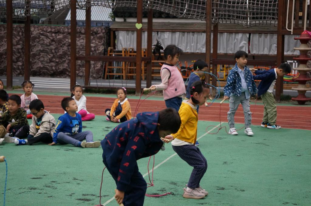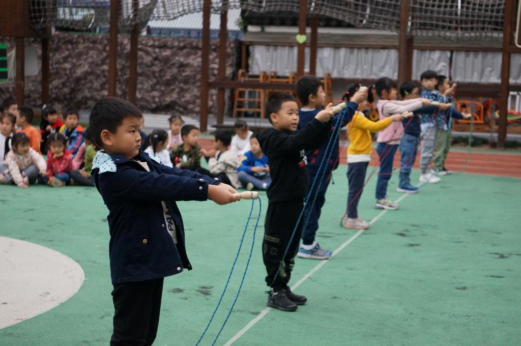所有幼儿蓄势待发,准备在跳绳比赛中勇夺桂冠。