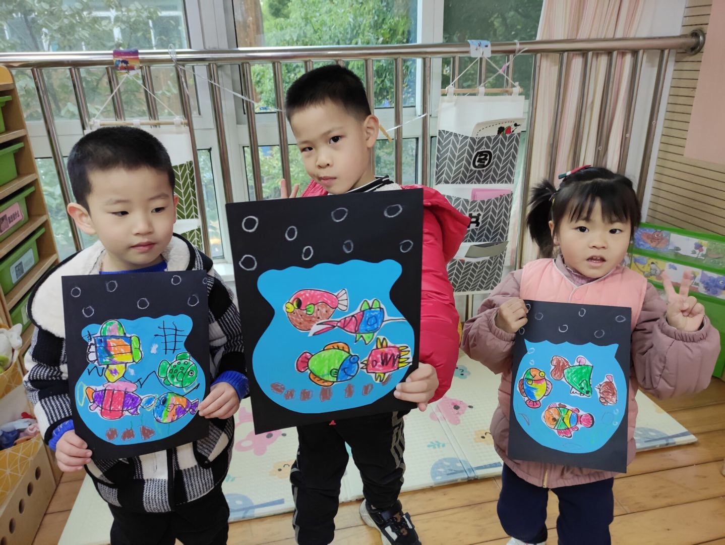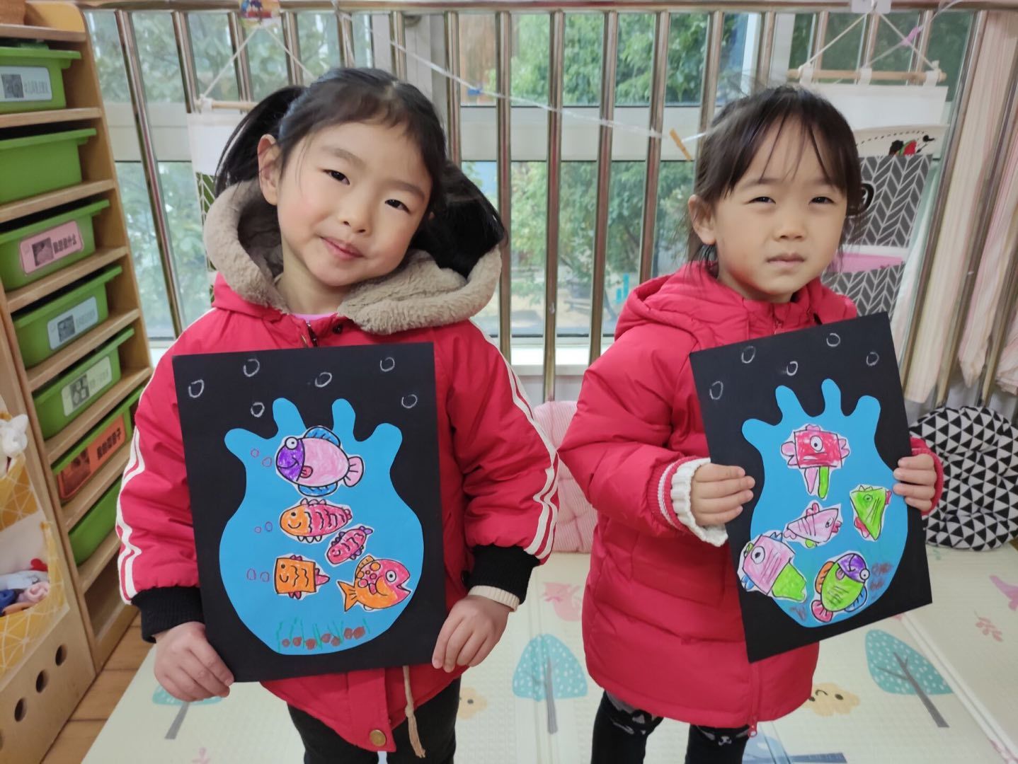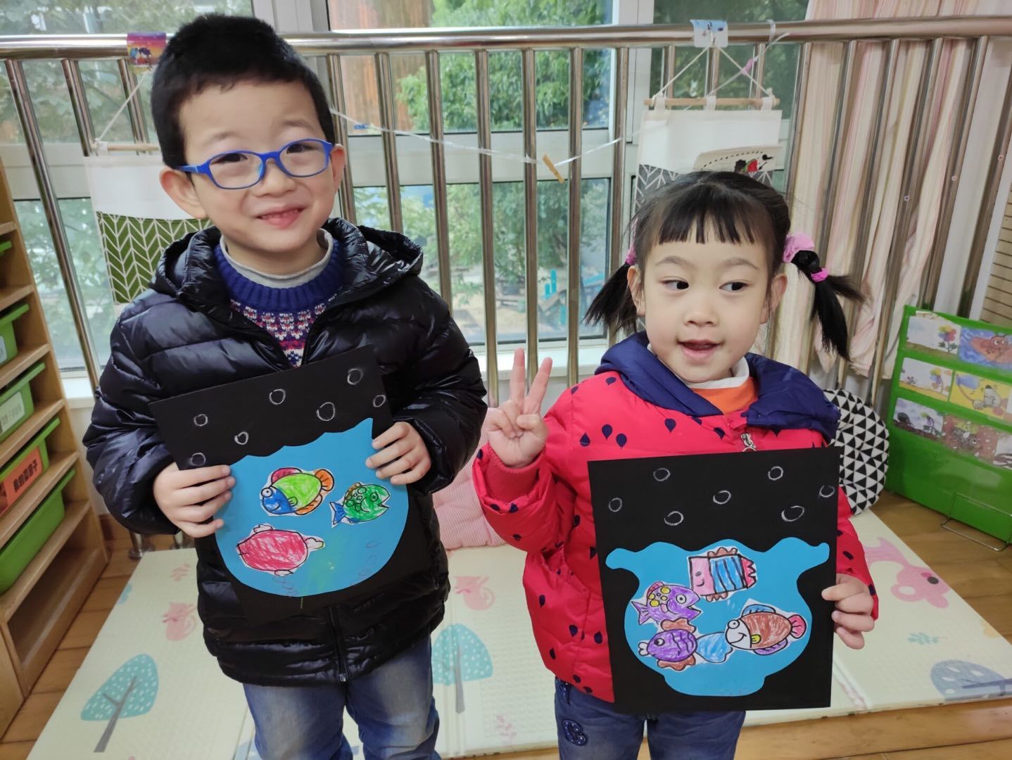 可爱的小鱼游啊游,我们还给鱼缸加了水草和好多泡泡,真可爱!