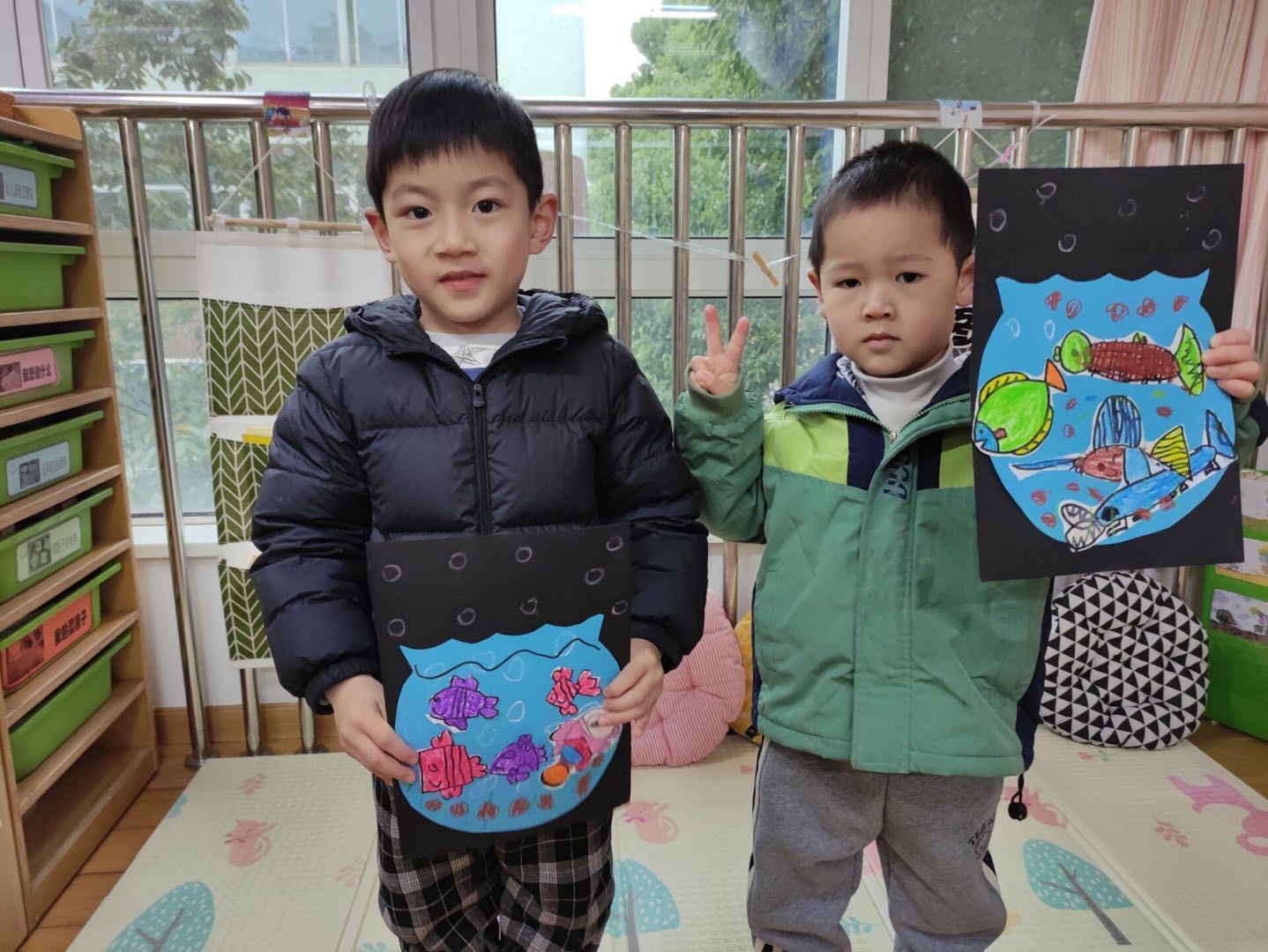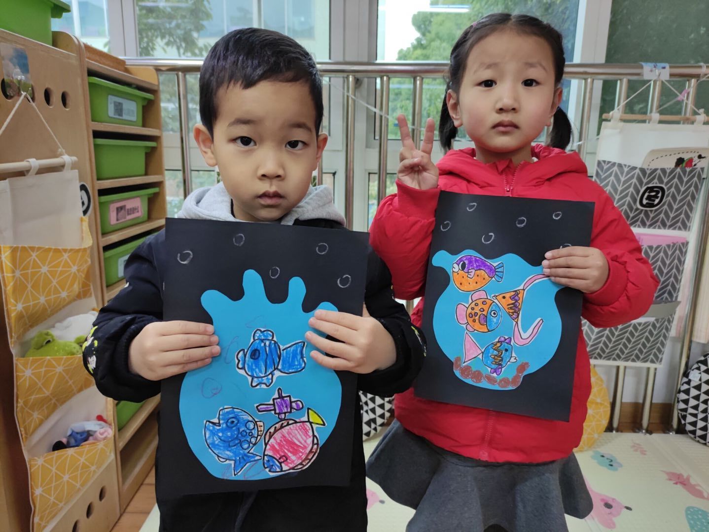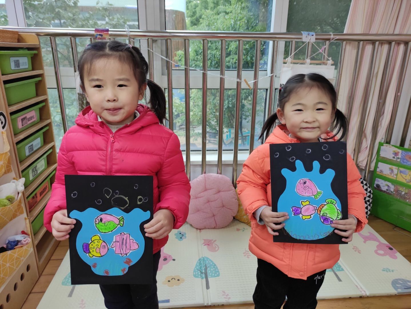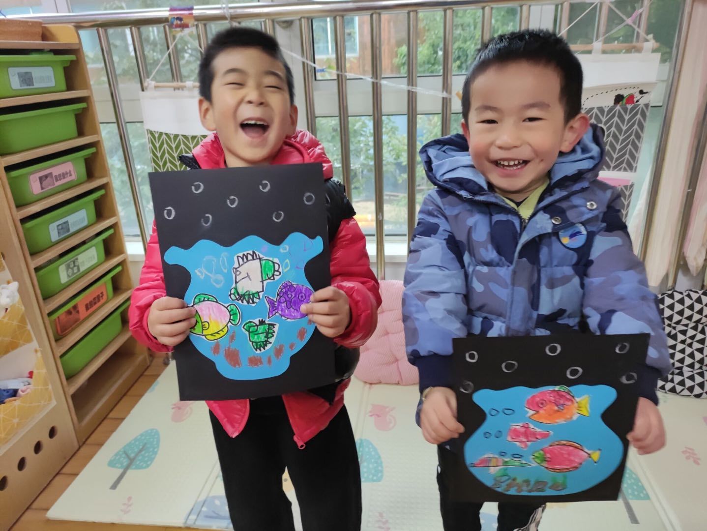 可爱的小鱼游啊游,我们还给鱼缸加了水草和好多泡泡,真可爱!